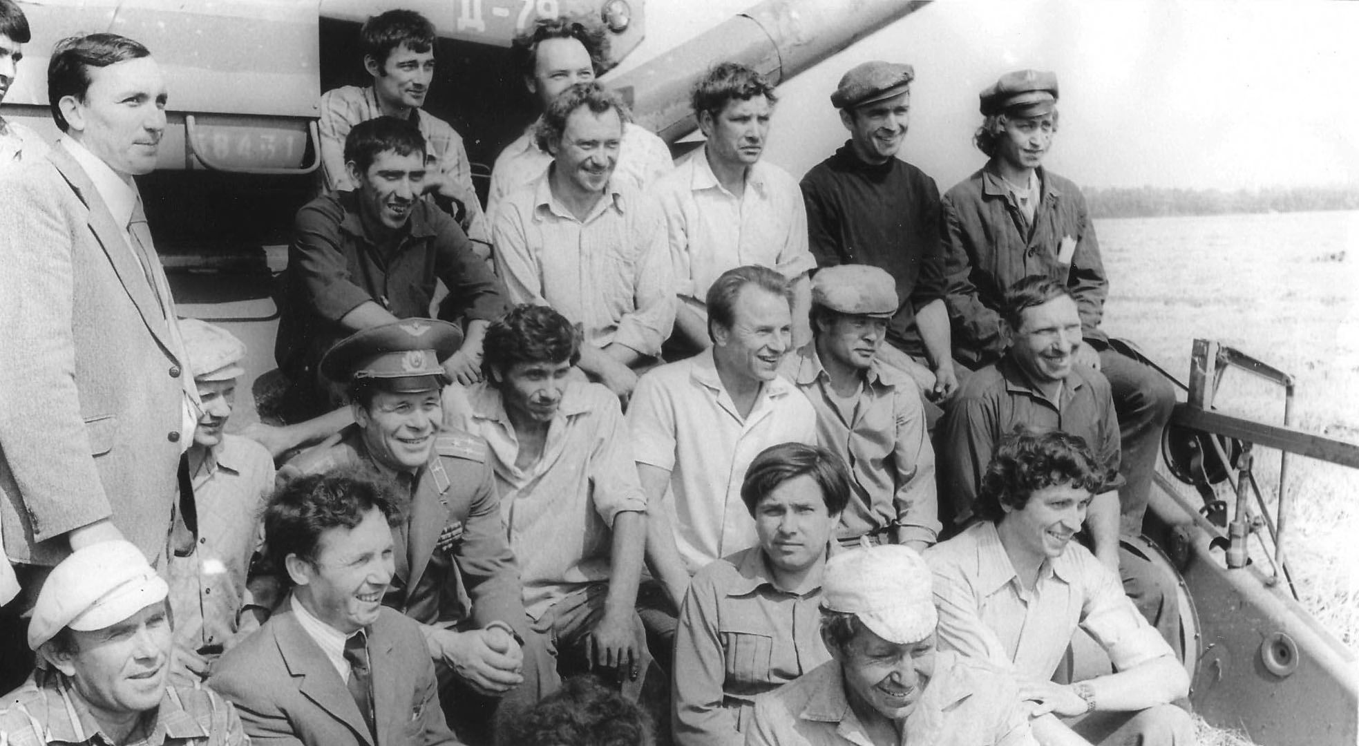 Встреча лётчика-космонавта СССР № 15, полковника ВВС, Героя Советского Союза Хрунова Евгения Васильевича с уборочно-тракторным звеном К.И. Тупицына колхоза «60 лет ВЛКСМ». Е.В. Хрунов был вторым среди советских космонавтов, побывавших в открытом космосе. 1979 г. Тамбовский район, с. Столовое. ГАСПИТО. Ф. П-9248. Оп. 1. Ед. хр. 4826