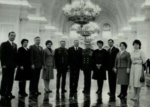 Летчик-космонавт, дважды Герой Советского Союза Николаев Андриян Григорьевич – летчик-космонавт, дважды Герой Советского Союза (7-й слева) с депутатами Верховного Совета РСФСР 11-го созыва от Тамбовской области на сессии Верховного Совета РСФСР. Слева направо: В.В. Колодин – бригадир МТФ совхоза «Орловский» Тамбовского района, Т.П. Колмакова – доярка колхоза «Гигант» Жердевского района, В.А. Нестеров – 2-й секретарь Тамбовского обкома КПСС, Н.Н. Юдакова – главный агроном колхоза им. В.И. Чапаева Староюрьевского района, И.П. Репин – генерал-полковник, начальник политуправления Московского ВО, Е.М. Подольский – 1-й секретарь Тамбовского обкома КПСС, А.Г. Николаев – летчик-космонавт, дважды Герой Советского Союза, Ю.М. Быкова – монтажница ПО «Ревтруд», А.А. Киселев – механизатор колхоза «Волна революции» Рассказовского района, Е.Е. Воропаева – бригадир МТФ учхоза «Комсомолец» Мичуринского района. Июнь 1986 г. г. Москва, Большой Кремлевский Дворец. ГАСПИТО. Ф. ?