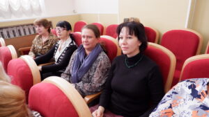 Архивисты отдела комплектования и упорядочения документов ГАСПИТО –участники новогоднего концерта для представителей ветеранских организаций Тамбовской области в актовом зале ТОГБ ПОУ «Тамбовский колледж искусств». Справа налево: заведующий сектором по научно-технической обработке документов И.И. Селиванова, заведующий отделом О.Н. Каниковская. 15 января 2026 г. г. Тамбов, ул. Августа Бебеля, 21