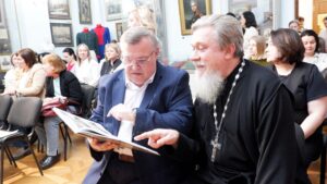 Участники презентации книги «Тамбовский областной краеведческий музей. История. Люди. Коллекции», посвященной 145-летию Тамбовского областного краеведческого музея. На переднем плане справа – кандидат исторических наук, кандидат богословия, заведующий отделом по культуре Тамбовской епархии протоиерей Виктор Лисюнин; слева – директор ТОКМ, заслуженный работник культуры и искусства Тамбовской области, член президиума Совета музеев России А.И. Чиликин 24 декабря 2025 г. г. Тамбов, ул. Державинская, 3
