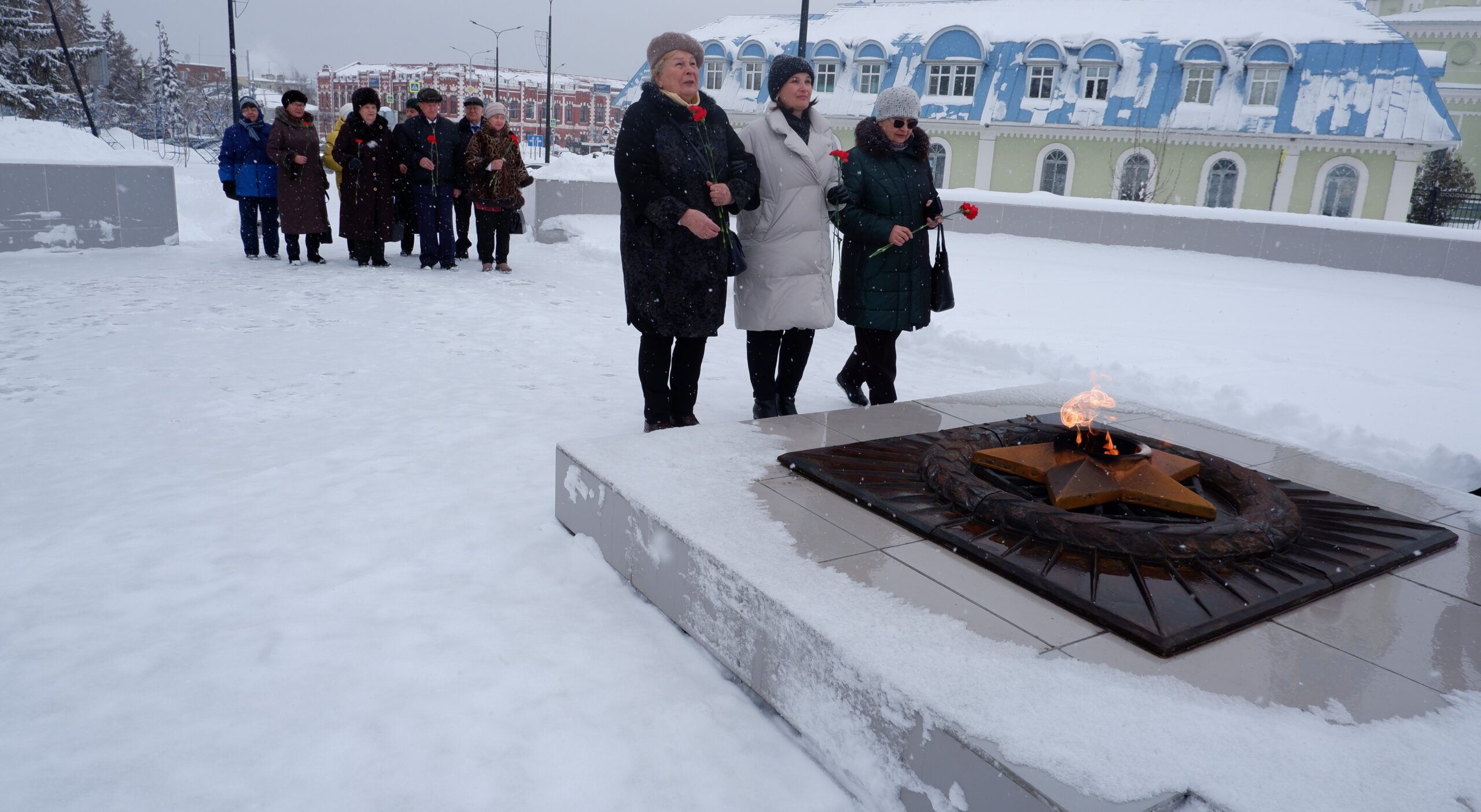 Участники торжественной акции «За строкой Книги Памяти…» у мемориала павшим в годы Великой Отечественной войны 1941-1945 гг. в Ленинском парке г. Рассказово. Первая слева – ведущий архивист отдела комплектования и упорядочения документов ГАСПИТО С.А. Сысоева. 26 февраля 2026 г. Тамбовская обл., г. Рассказово, ул. Парковая