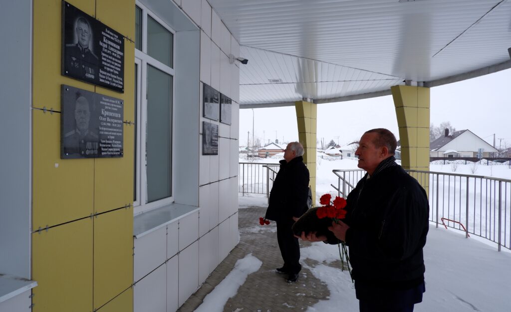 Заместитель председателя ТООО ВОО ветеранов, полковник в отставке Л.Н. Конобеев (справа) и заместитель председателя ТООО ВОО ветеранов, доктор технических наук, профессор С.Н. Сазонов (слева) возлагают цветы к мемориальным доскам участников СВО на фасаде МАОУ СОШ № 5 «Центр ИнТех» г. Рассказово. 26 февраля 2026 г. Тамбовская обл., г. Рассказово, ул. Гоголя, д. 5А