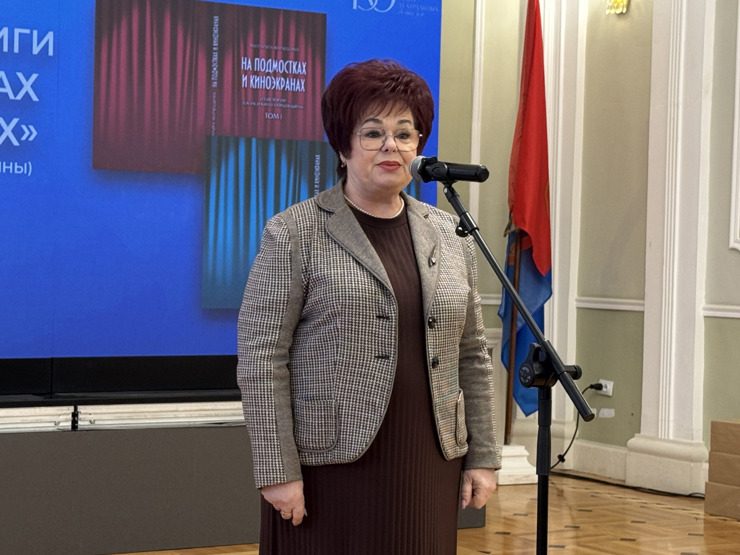 Экземпляры двухтомного издания журналиста, писателя, члена ТРО ООО «Союз журналистов России», театроведа, лауреата международных, всероссийских, областных конкурсов, литературной премии «Светунец» им. В.А. Богданова М.В. Матюшиной «На подмостках и киноэкранах» в академическом зале ТОГАУК «Тамбовтеатр». 15 декабря 2025 г. г. Тамбов,