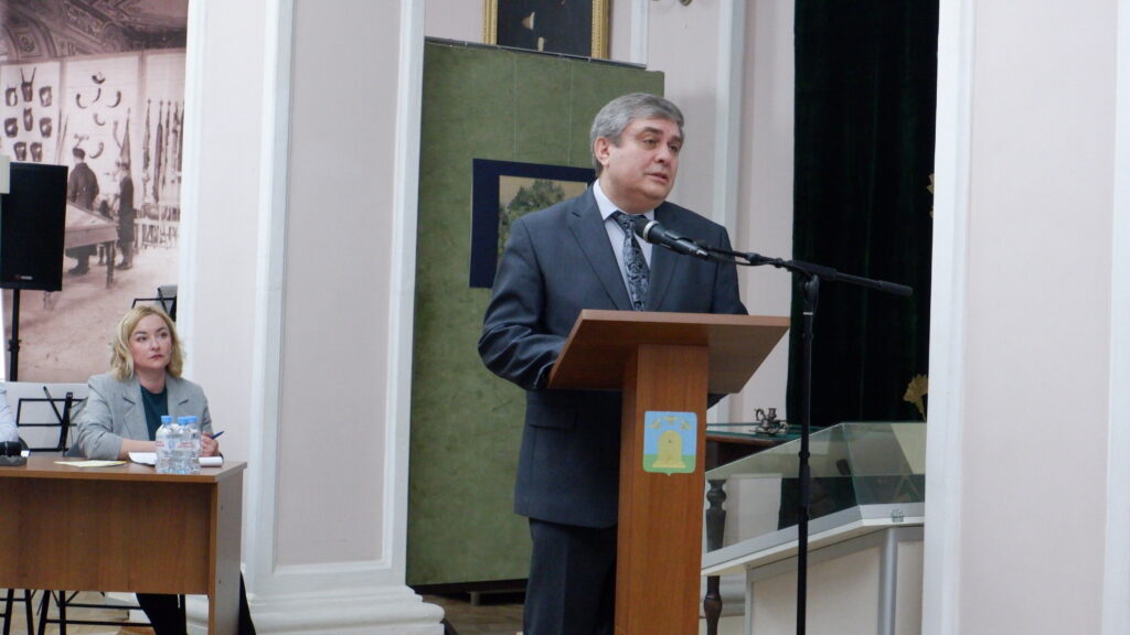Ректор Тамбовского государственного музыкально-педагогического института им. С.В. Рахманинова, профессор, заслуженный артист РФ Р.Н. Бажилин выступает на ХI Рахманиновских чтениях в ИОЦ «Русский музей: виртуальный филиал» ТОГБУК «ТОКМ». 2 апреля 2026 г. г. Тамбов, ул. Державинская, 3