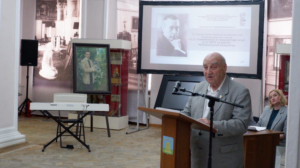 Член Союза писателей России, заслуженный работник культуры РФ, почетный гражданин Тамбовской области В.С. Аршанский выступает на ХI Рахманиновских чтениях в ИОЦ «Русский музей: виртуальный филиал» ТОГБУК «ТОКМ». 2 апреля 2026 г. г. Тамбов, ул. Державинская, 3