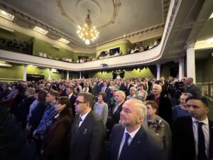 Участники торжественного собрания «Сквозь время», посвященного 390-летию со дня основания г. Тамбова, во время исполнения Гимна РФ в большом зале Тамбовтеатра. Общий вид зала. 27 апреля 2026 г. г. Тамбов, ул. Интернациональная, 15