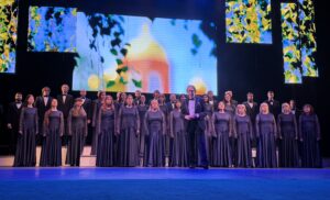 Камерный хор им. С.В. Рахманинова выступает на торжественном собрании «Сквозь время», посвященном 390-летию со дня основания г. Тамбова, в большом зале Тамбовтеатра. В центре – заслуженный деятель искусств РФ, заслуженный деятель Всероссийского музыкального общества, Герой Труда Тамбовской области, профессор В.В. Козляков. 27 апреля 2026 г. г. Тамбов, ул. Интернациональная, 15