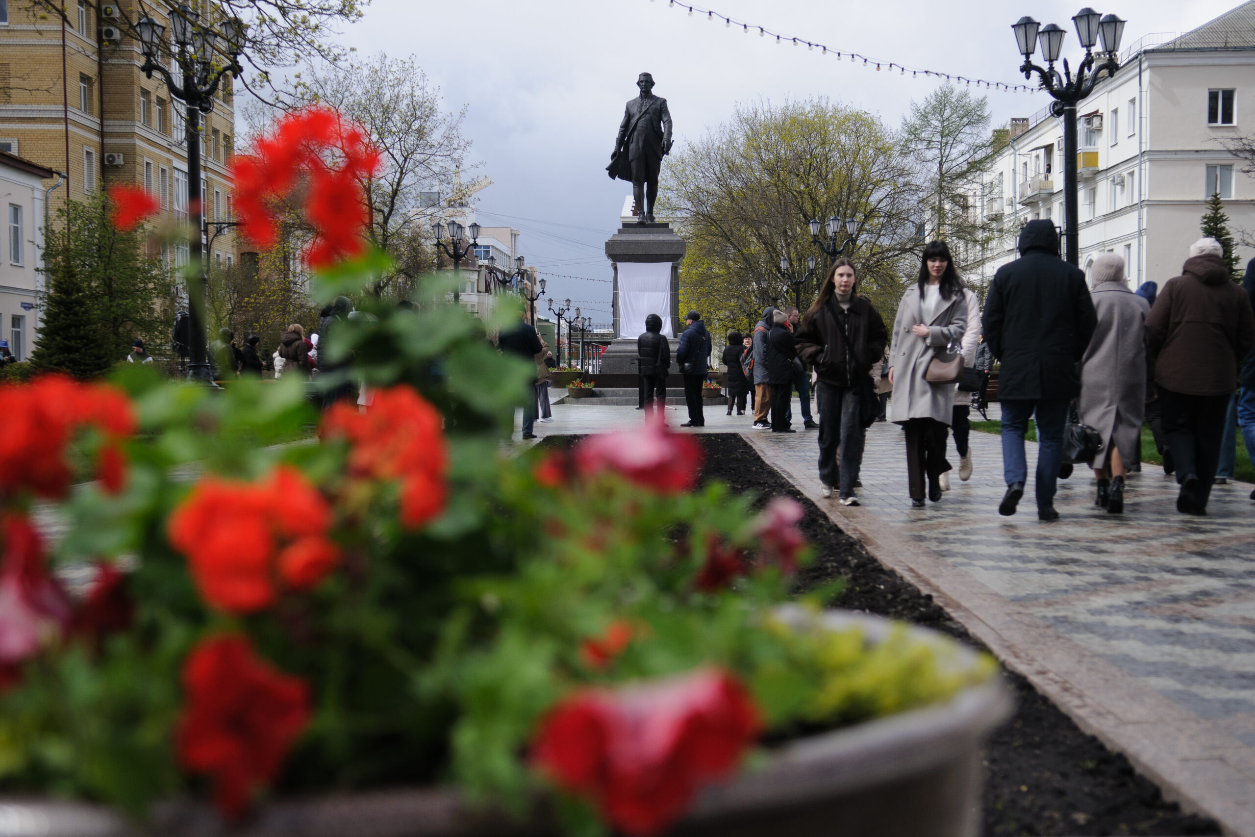 Памятник Г.Р. Державину в одноименном сквере г. Тамбова перед церемонией открытия. 27 апреля 2026 г. Автор съемки – А. Бучнев