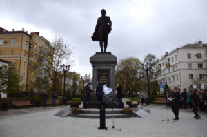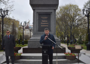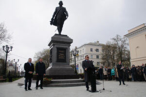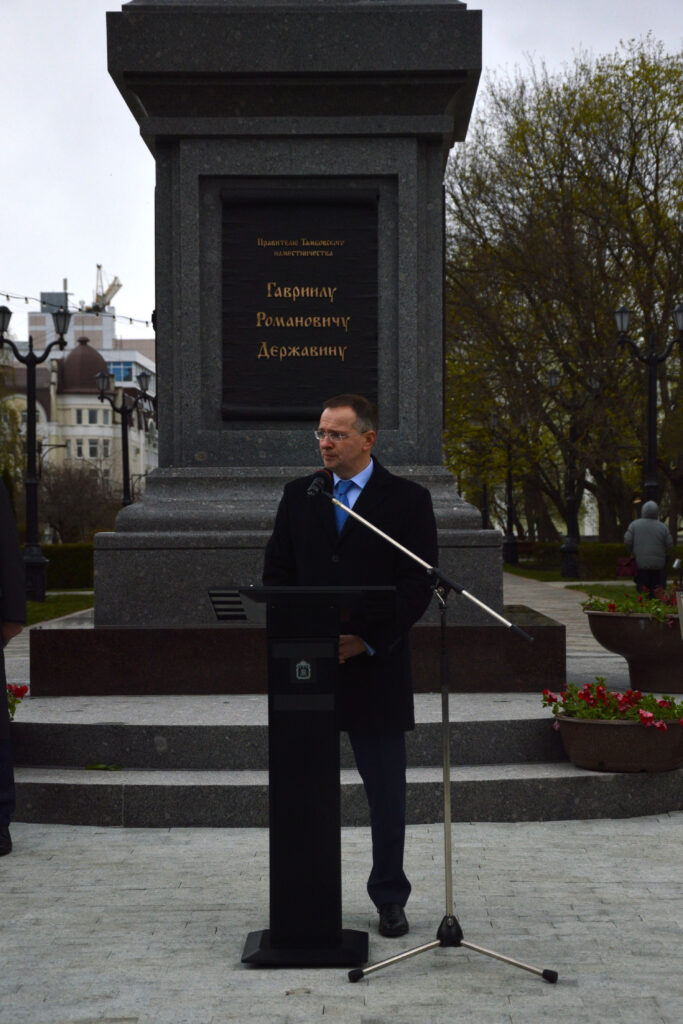 Глава Тамбовской области Е.А. Первышов выступает на церемонии открытия памятника Г.Р. Державину в одноименном сквере г. Тамбова. 27 апреля 2026 г. Автор съемки – Н.Ф. Комаров