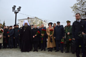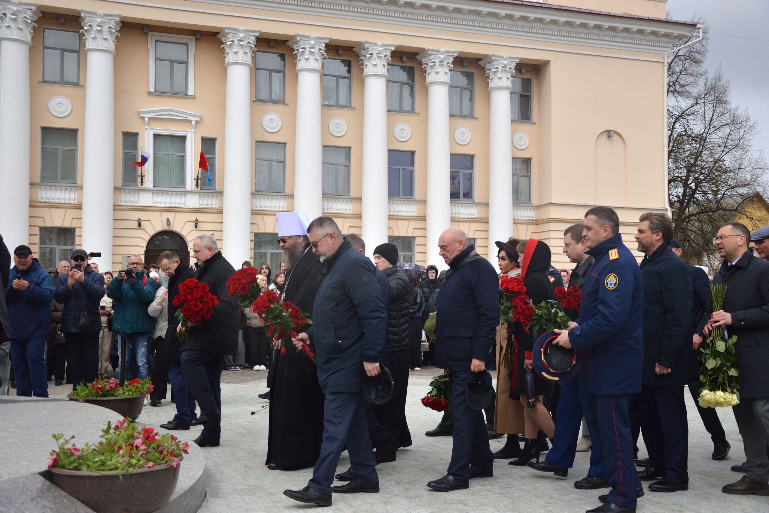 Участники торжественной церемонии открытия памятника Г.Р. Державину в одноименном сквере г. Тамбова. Возложение цветов. 27 апреля 2026 г. Автор съемки – Н.Ф. Комаров