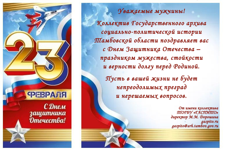 Коллектив Государственного архива социально-политической истории Тамбовской области поздравляет мужчин с 23 февраля! Автор записи:М.М. Дорошина Рубрика записи:Новости Запись опубликована:20.02.2026 Вам также может понравиться Архивисты ГАСПИТО приняли участие в ХХV межрегиональной научной конференции «Тамбов в прошлом, настоящем и будущем» 26.04.2024 В рамках проведения профсоюзного Дня здоровья архивисты ГАСПИТО посетили боулинг-клуб «Голден страйк» 14.01.2025 Сотрудники ГАСПИТО приняли участие в первомайских праздничных мероприятиях 03.05.2017