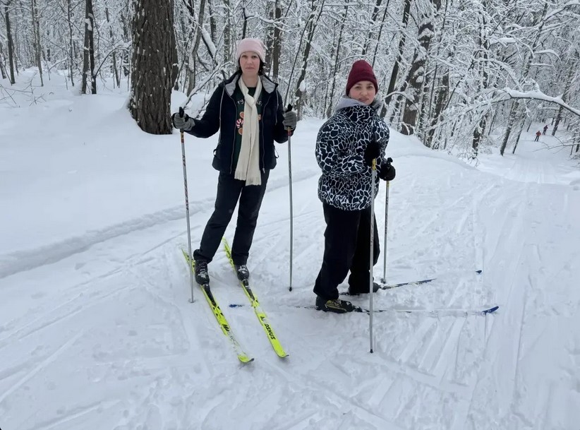 Работники ГАСПИТО – участники Дня профсоюзного семейного отдыха. Слева направо: заведующий сектором по НТО документов отдела комплектования и упорядочения документов И.И. Селиванова; заместитель директора И.Б. Матико. 7 февраля 2026 г. Лыжная база «Перун»