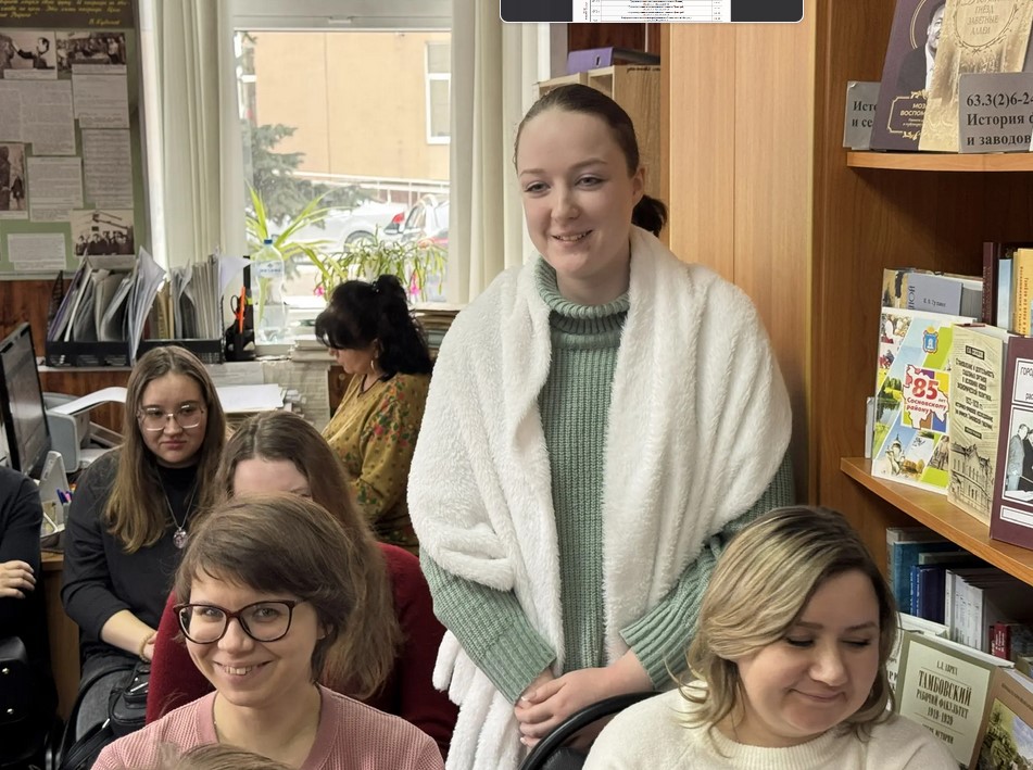 Отчетное собрание первичной профсоюзной организации ГАСПИТО. Выступает председатель Молодежного совета, ведущий архивист отдела использования документов и информатизации Д.С. Пунина. 19 февраля 2026 г. г. Тамбов, ул. Интернациональная, 35 (читальный зал ГАСПИТО)