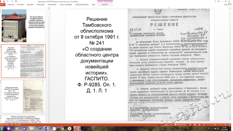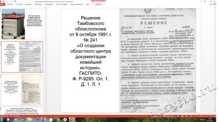 На заседании круглого стола в онлайн-формате прозвучало сообщение заведующего отделом использования документов и информатизации ГАСПИТО И.И. Муравьевой «Об опыте работы Государственного архива социально-политической истории Тамбовской области по рассекречиванию архивных документов», сопровождающееся видеорядом.