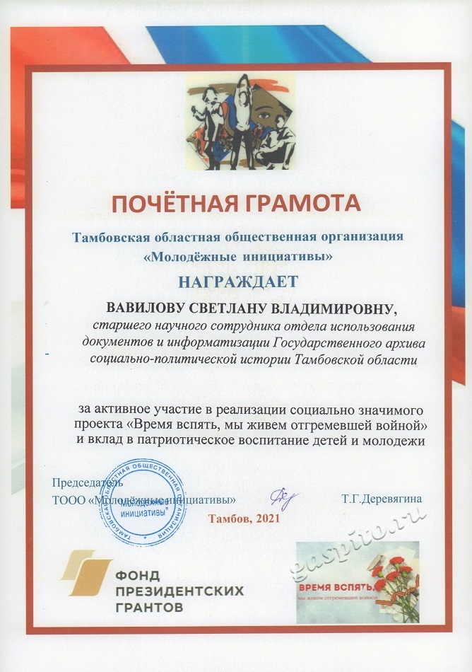 В адрес заведующего отделом использования документов и информатизации ГАСПИТО И.И. Муравьевой поступило благодарственное письмо Общественной палаты Тамбовской области за активное участие в работе по реализации проекта «Время вспять, мы живем отгремевшей войной», поддержанного Фондом президентских грантов.