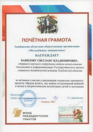 Почетной грамотой Тамбовской областной общественной организации «Молодежные инициативы» награждена старший научный сотрудник отдела использования документов и информатизации С.В. Вавилова за активное участие в реализации социально-значимого проекта и вклад в патриотическое воспитание детей и молодежи.