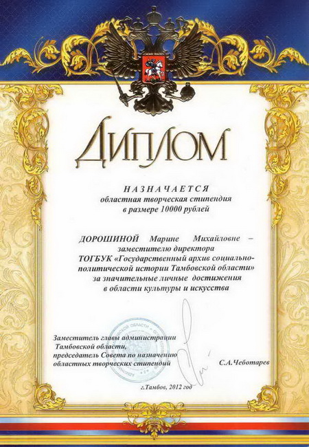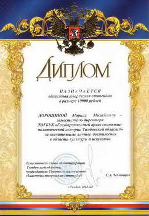 23 марта 2012 г. заместитель директора ТОГБУ «ГАСПИТО» М.М.Дорошина по итогам конкурса «Областные творческие стипендии в области культуры, искусства, народного творчества, художественного образования и архивного дела» получила диплом победителя и стипендию в размере 10000 рублей за значительные личные достижения в области культуры и искусства.