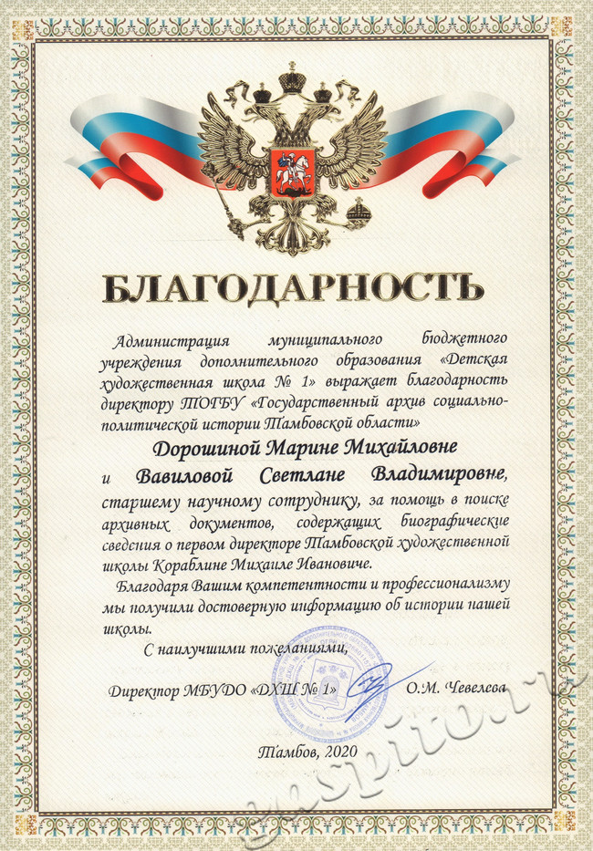 В адрес директора архива М.М. Дорошиной и старшего научного сотрудника отдела использования документов и информатизации С.В. Вавиловой поступила благодарность администрации муниципального бюджетного учреждения дополнительного образования «Детская художественная школа № 1» за оказанную помощь в поиске архивных документов о первом директоре Тамбовской художественной школы М.И. Кораблине.