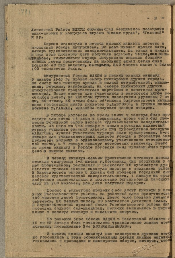 Тамбовский горком комсомола собрал для детей фронтовиков 35 тыс. рублей на приобретение новогодних подарков и 2404 комплекта вещей и обуви, которые раздавались на новогодних елках.
