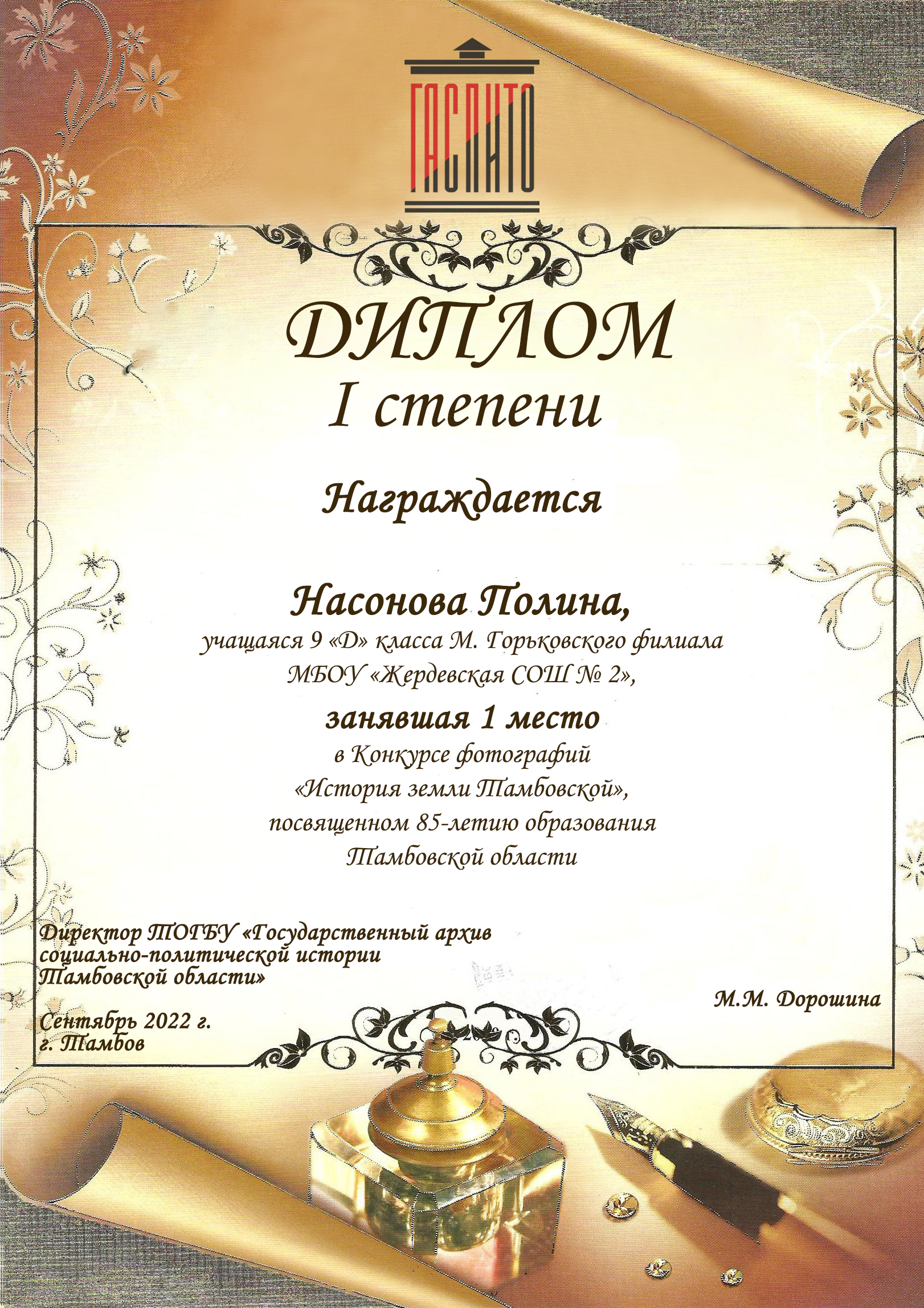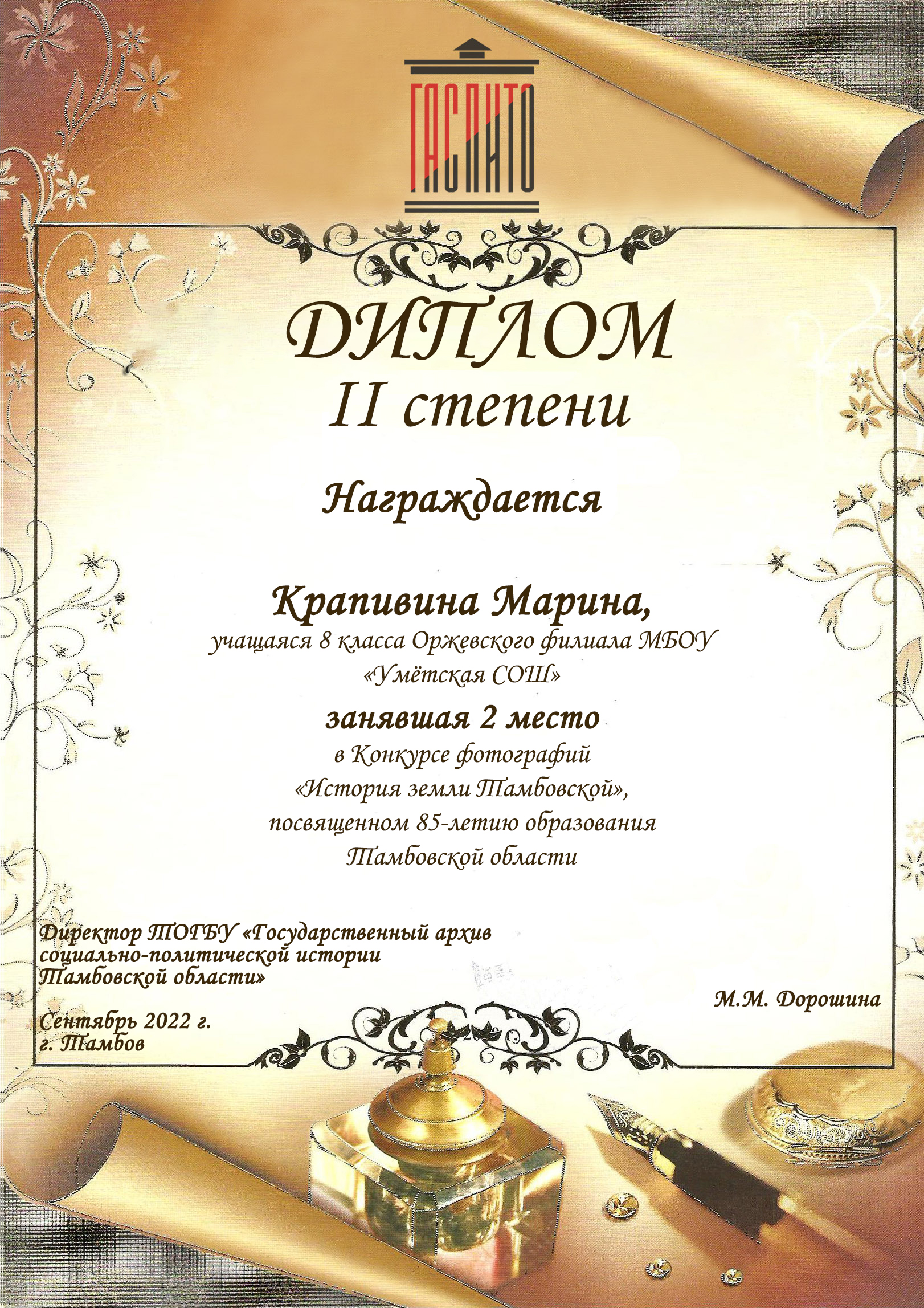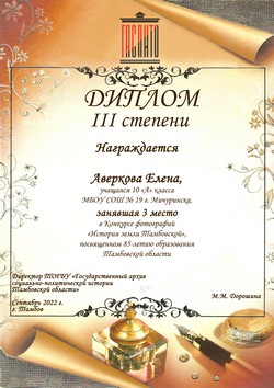 Первое место среди учащихся средних общеобразовательных школ заняла П. Насонова (М. Горьковский филиал МБОУ «Жердевская СОШ № 2), второе место присуждено М. Крапивиной (Оржевский филиал МБОУ «Уметская СОШ»), третье место – Е. Аверковой (МБОУ СОШ № 19 г. Мичуринска).