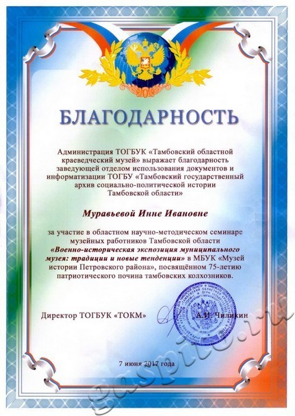 7 июня 2017 г. состоялся семинар музейных работников Тамбовской области «Военно-историческая экспозиция муниципального музея: традиции и новые тенденции». Семинар проходил на базе муниципального бюджетного учреждения культуры «Музей истории Петровского района» и его филиала в с. Дубовое и был посвящен 75-летию патриотического почина тамбовских колхозников по сбору денежных средств на строительство танковой колонны «Тамбовский колхозник».