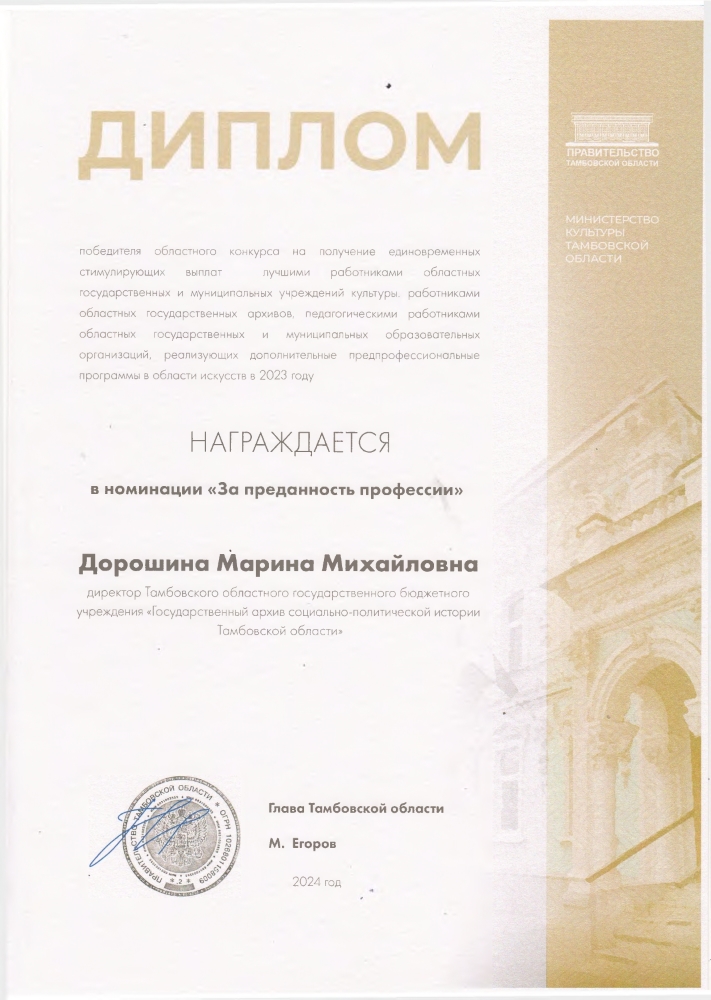 2 февраля 2024 г. в здании Тамбовского государственного академического драматического театра состоялось торжественное вручение дипломов победителям областного конкурса на получение единовременных стимулирующих выплат лучшими работниками областных государственных и муниципальных учреждений культуры, работниками областных государственных архивов, педагогическими работниками областных государственных и муниципальных образовательных организаций, реализующих дополнительные предпрофессиональные программы в области искусств, в 2023 году.