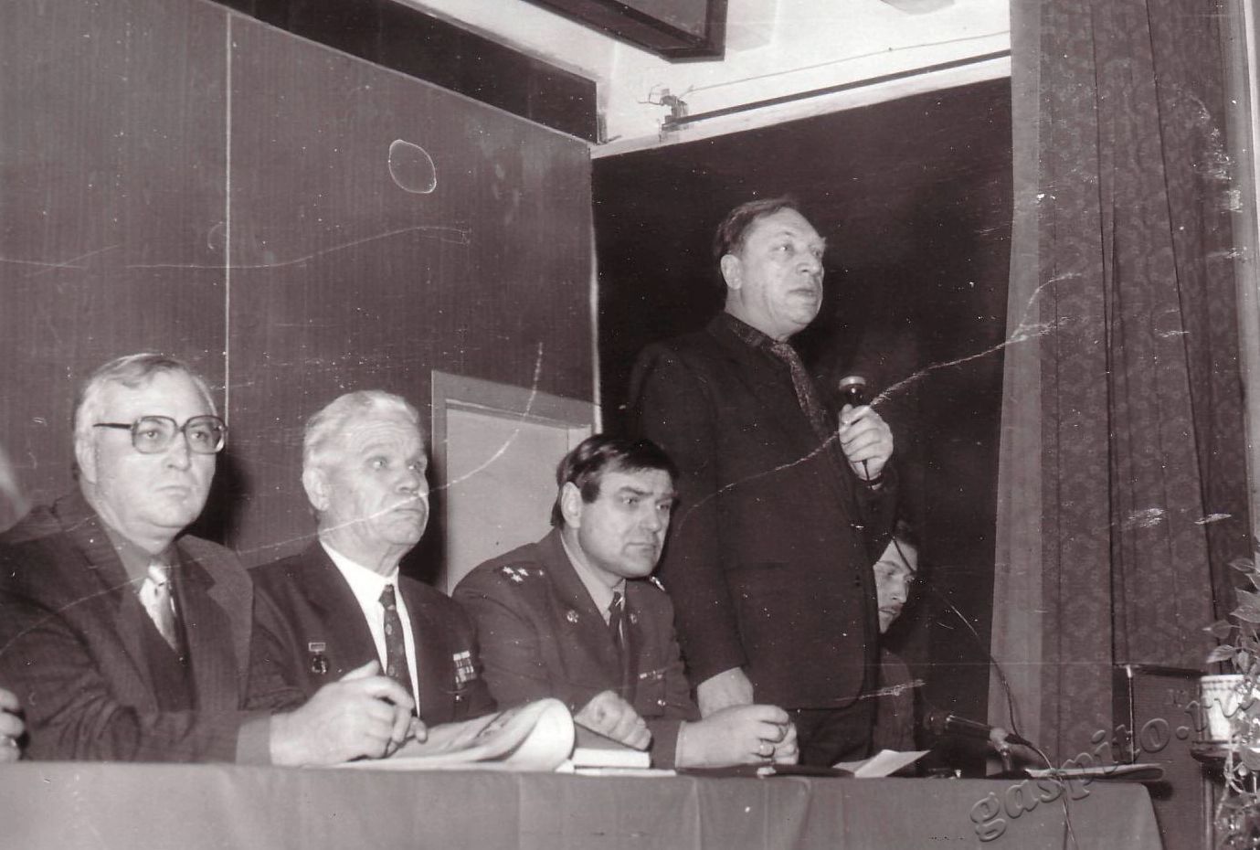 Описание: Собрание, посвященное памяти воинов, погибших в Афганистане. Александр Иванович Рудаков, председатель Тамбовской областной организации Российского Союза ветеранов Афганистана, открывает собрание. Слева направо: первый — Юрий Николаевич Старчиков, председатель Тамбовской городской Думы; второй — Василий Николаевич Паринов, председатель Тамбовского областного совета ветеранов Великой Отечественной войны; третий — Алексей Лукич Троцюк, заместитель областного военного комиссара, полковник; четвертый — Александр Иванович Рудаков, председатель Тамбовской областной организации Российского Союза ветеранов Афганистана; пятый — Алексей Викторович Куликов, директор школы № 34 г.Тамбова.