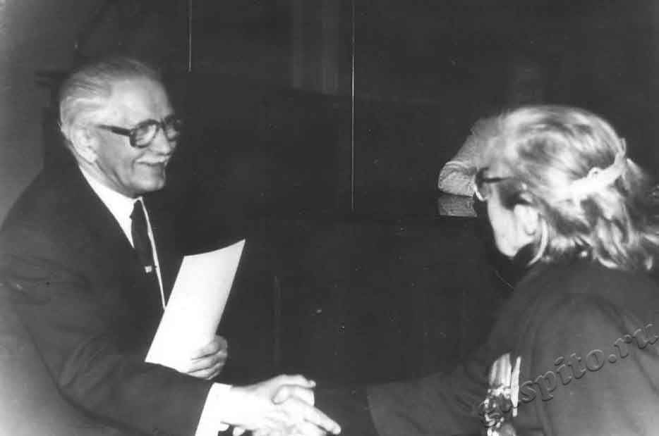 Описание: Фотодокументы Тамбовской областной организации пенсионеров-ветеранов, инвалидов войны, труда, Вооруженных Сил и правоохранительных органов. Юлий Порфирьевич Ксюнин, председатель Тамбовского городского комитета ветеранов войны, вручает грамоту Полине Григорьевне Михайловой, бывшей партизанке полка Сатчикова в Белоруссии в честь 30-летия Тамбовского клуба ветеранов партизанского движения и подпольщиков.