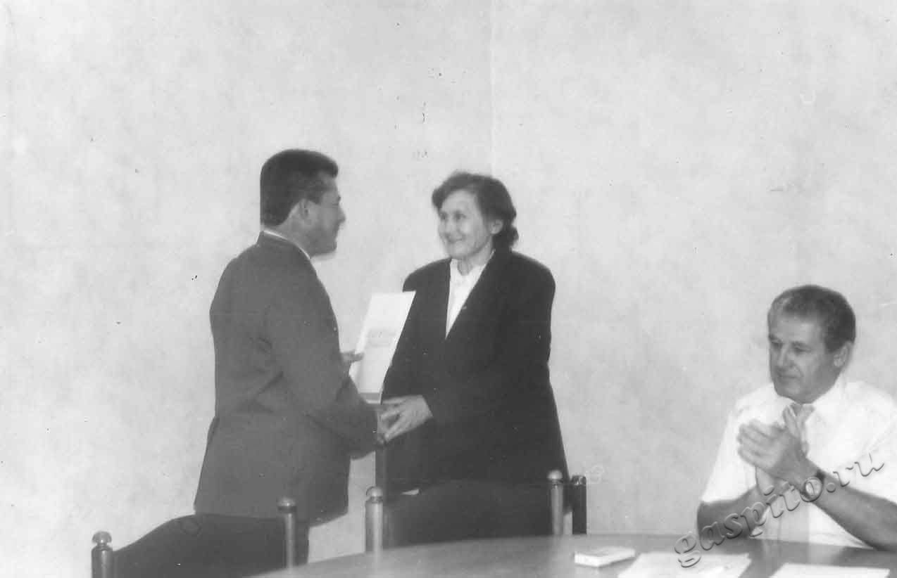 Описание: Фотодокументы Тамбовской областной организации пенсионеров-ветеранов, инвалидов войны, труда, Вооруженных Сил и правоохранительных органов. Юрий Николаевич Гуркин, заместитель главы администрации Тамбовской области, вручает грамоту Людмиле Владимировне Проваловой, директору Центра документации новейшей истории Тамбовской области (ЦДНИТО).