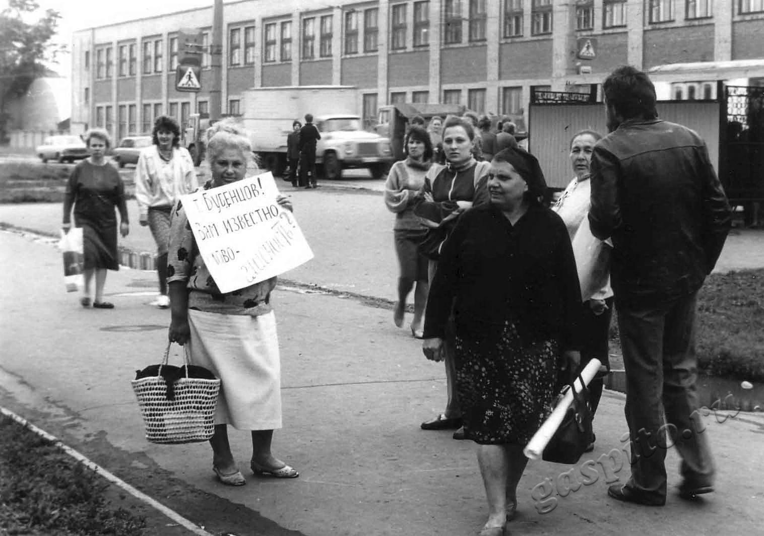 Описание: Пикет членов ТГО ВДИПО 26-й конференции Тамбовской областной организации КПСС. Людмила Михайловна Спиридонова, член Тамбовского городского отделения Всесоюзного добровольного историко-просветительского общества «Мемориал», на пикетировании редакции областной общественно-политической газеты «Тамбовская правда».