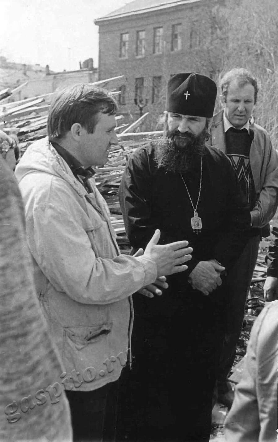 Описание: Участники субботника по восстановлению Предтеченской церкви Казанского монастыря, среди присутствующих слева направо: первый – Владимир Павлович Середа, член Тамбовского городского отделения Всесоюзного добровольного историко-просветительского общества «Мемориал»; второй – архиепископ Тамбовский и Мичуринский Евгений.