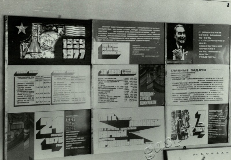 Описание: Стенд «Этапы большого пути». (Экспозиция пропагандирует достижения СССР за годы советской власти).