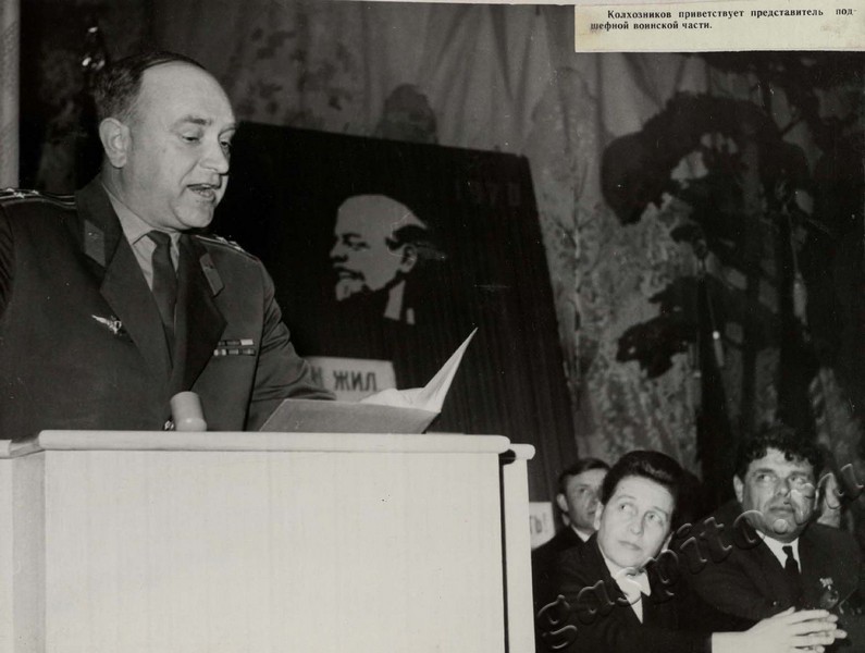 Описание: Колхозников приветствует представитель подшефной воинской части.