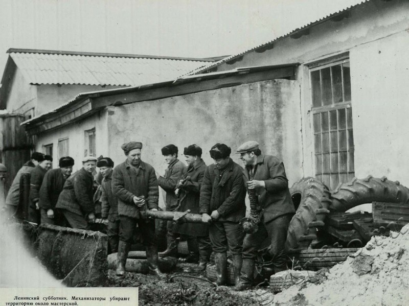 Описание: Ленинский субботник. Механизаторы убирают территорию около мастерской.