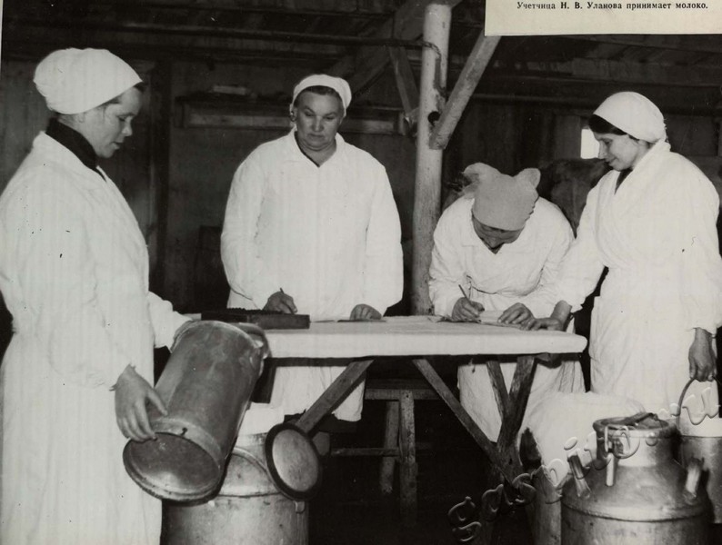 Описание: Учетчица Н.В.Уланова принимает молоко.