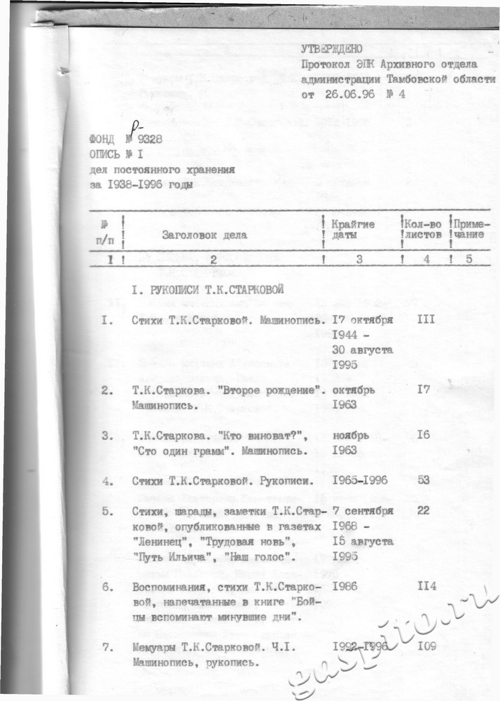 Опись №1 Автор записи:И.И. Муравьева Рубрика записи:Ф.Р-9328 Старкова Тамара Константиновна (1913- ) Запись опубликована:01.10.2019 Вам также может понравиться Опись №2 01.10.2019
