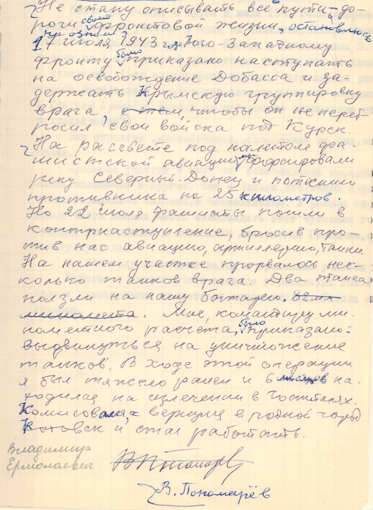 Пономарев Владимир Ермолаевич родился в 1923 г. в д. Лужки Тамбовского уезда Тамбовской губернии (ныне Тамбовского района и области) в крестьянской семье. Обучался в средних школах № 1 и № 2 г. Котовска.