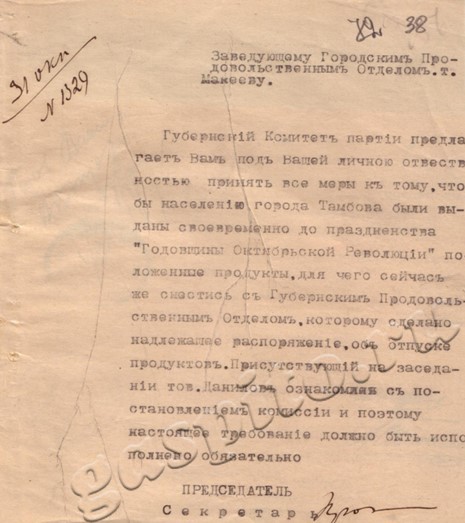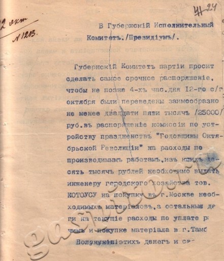 Продовольственному отделу надлежало немедленно принять все меры к тому, чтобы в распоряжение комиссии для г. Тамбова было предоставлено не менее 15 тысяч аршин ткани, которая должна была отпускаться по первому требованию в кредит, а расчет предполагалось произвести из сумм, выделенных на подготовку праздничных мероприятий.