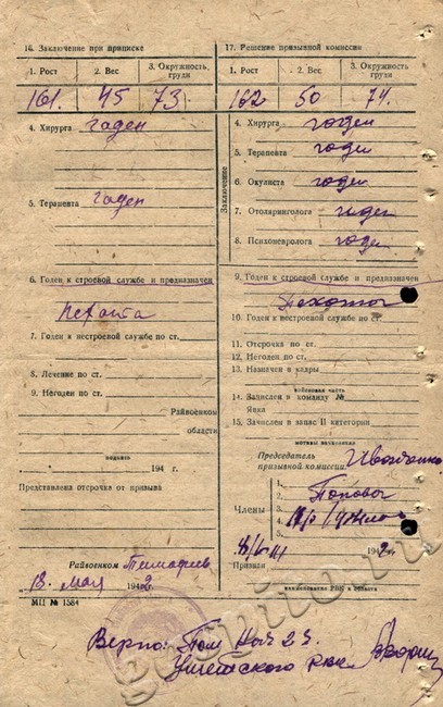 Карта призывника, составленная Уметским райвоенкоматом на М.П. Материкина