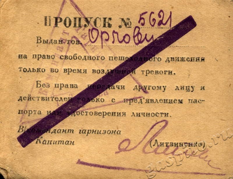 Пропуск на право свободного пешеходного движения во время воздушной тревоги, выданный комендантом Тамбовского гарнизона на имя Г.В. Орлова.
