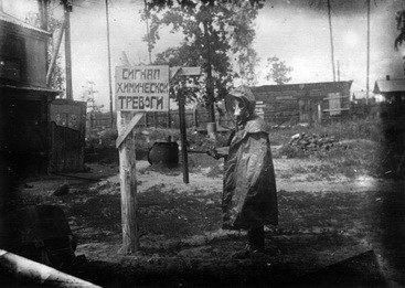 Учебные занятия по ПВХО на заводе № 204: подача сигнала химической тревоги при помощи гонга.