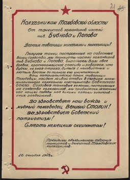 Благодарственное письмо танкистов частей генерал-майора танковых войск А.Ф. Попова и гвардии полковника Н.М. Бубнова колхозникам Тамбовской области за сбор средств на строительство танков «Тамбовский колхозник».