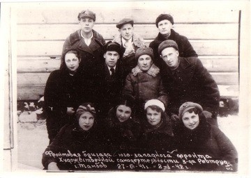 Фронтовая бригада художественной самодеятельности завода «Ревтруд» после выступления в воинских частях Юго-Западного фронта. Руководитель – Д.Н. Охотин (средний ряд, третий слева). 8 января 1942 г