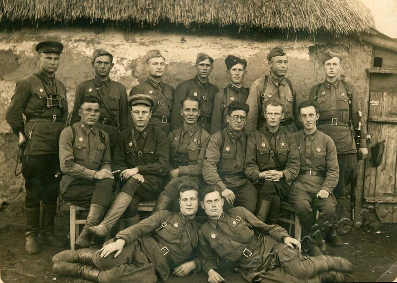 Начсостав и красноармейцы 323-й стрелковой дивизии. В центре, слева направо: И.Ф. Верещагин (военком), И.А. Гарцев (командир). 20 июня 1942 г. Западный фронт